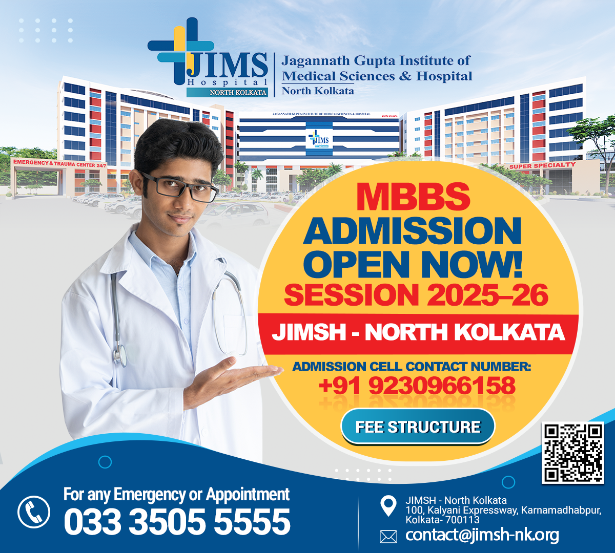 Strategically located in the Sodepur area on the Kalyani Expressway, just 12 km (about 20 minutes’ drive) from Kolkata Airport, JIMSH North Kolkata has been designed as a modern center of excellence, blending patient-centric clinical care, advanced medical technology, and innovative academic programs. The institute is committed to creating an environment where compassionate service meets world-class healthcare delivery.